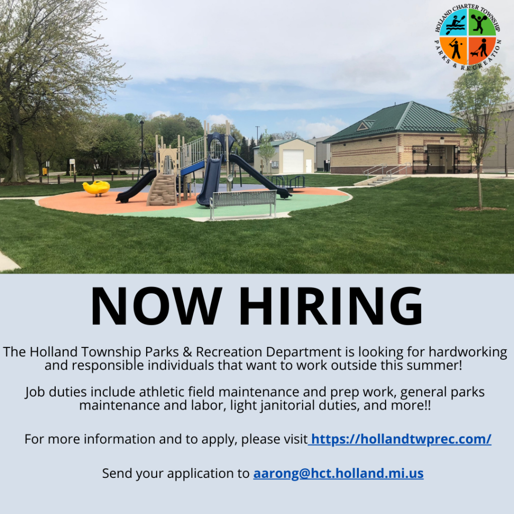 The Holland Charter Township Parks Department is hiring seasonal staff for the upcoming 2026 spring and summer season. We are looking for hardworking, responsible individuals who want to work outdoors. Job duties include general park maintenance and labor, athletic field maintenance and prep, and light janitorial duties. We have a variety of positions available for […]